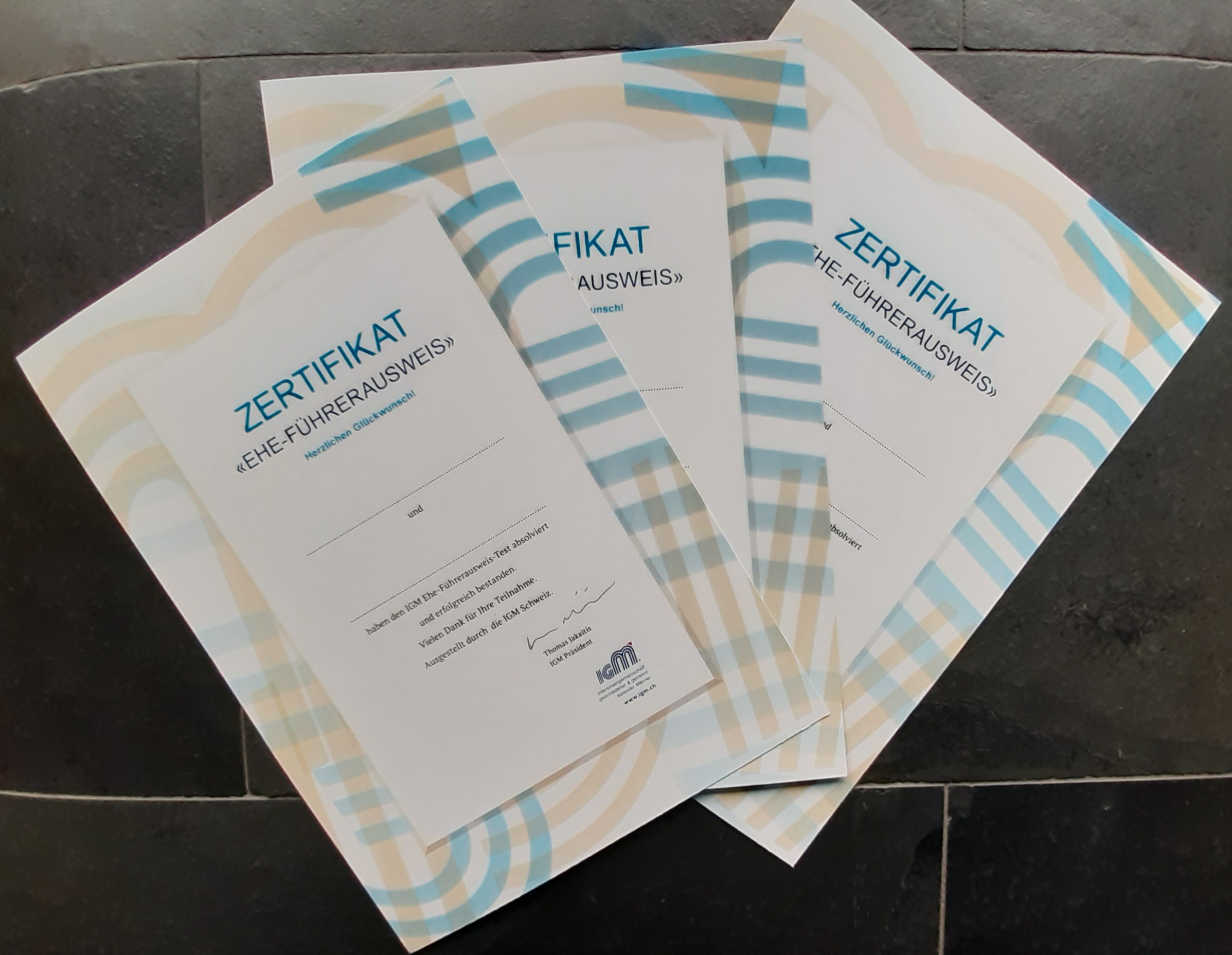 Beim Erreichen von mindestens 22 richtigen Antworten wird den Verlobten, Eheleuten und zukünftigen Ehepaaren die erfolgreiche Teilnahme mit dem Zertifikat «IGM Ehe-Führerausweis» bestätigt.
